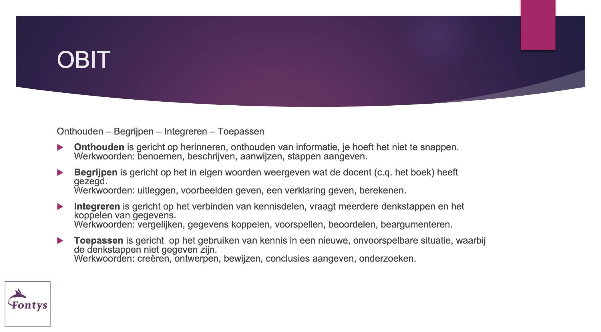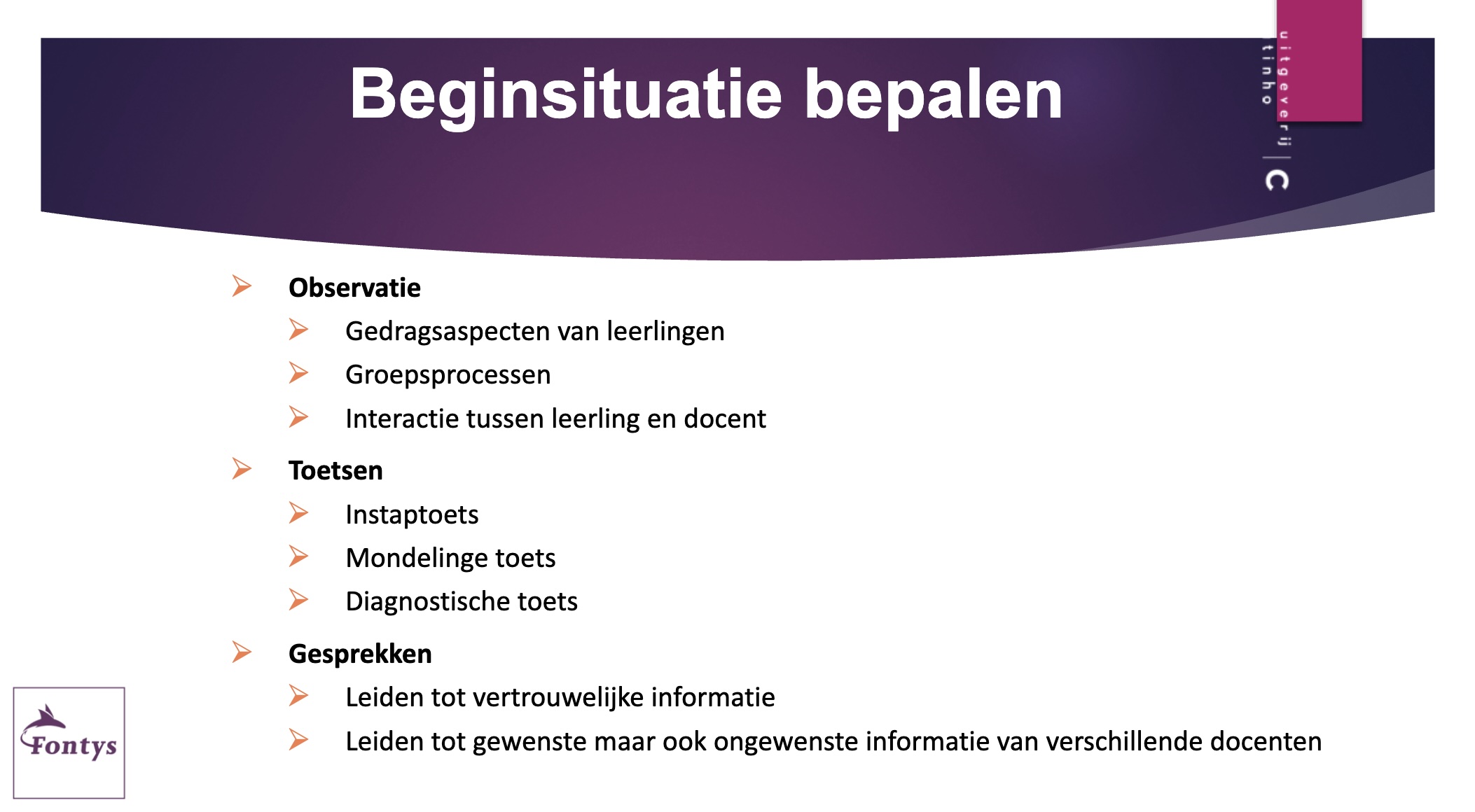 Debbie organiseert een tienminutengroepstoets over onderwijs- en leertheorieën. Hij geeft strikte spelregels (geen AI, geen telefoons, alleen fluistertoon, diskwalificatie bij overtreding) en verdeelt de vragen over teams. De theorievragen behandelen onder meer growth vs. fixed mindset, Kolb’s leerstijlen, behaviorisme, cognitivisme, sociaal-constructivisme, meervoudige intelligentie, geheugenmodellen, mnemonische technieken, motivatie en leerdoelen. Na de quiz bespreekt Debbie de scores, de invloed van tijdsdruk en strategieën (‘leren leren’), en reflecteert zij samen met de studenten op de werkvorm (betere concentratie door fluisteren, sociaal leren, straffen/belonen). Tot slot bespreekt zij kort het gebruik van observatieformulieren in Canvas voor lesvoorbereiding en -uitvoering.
