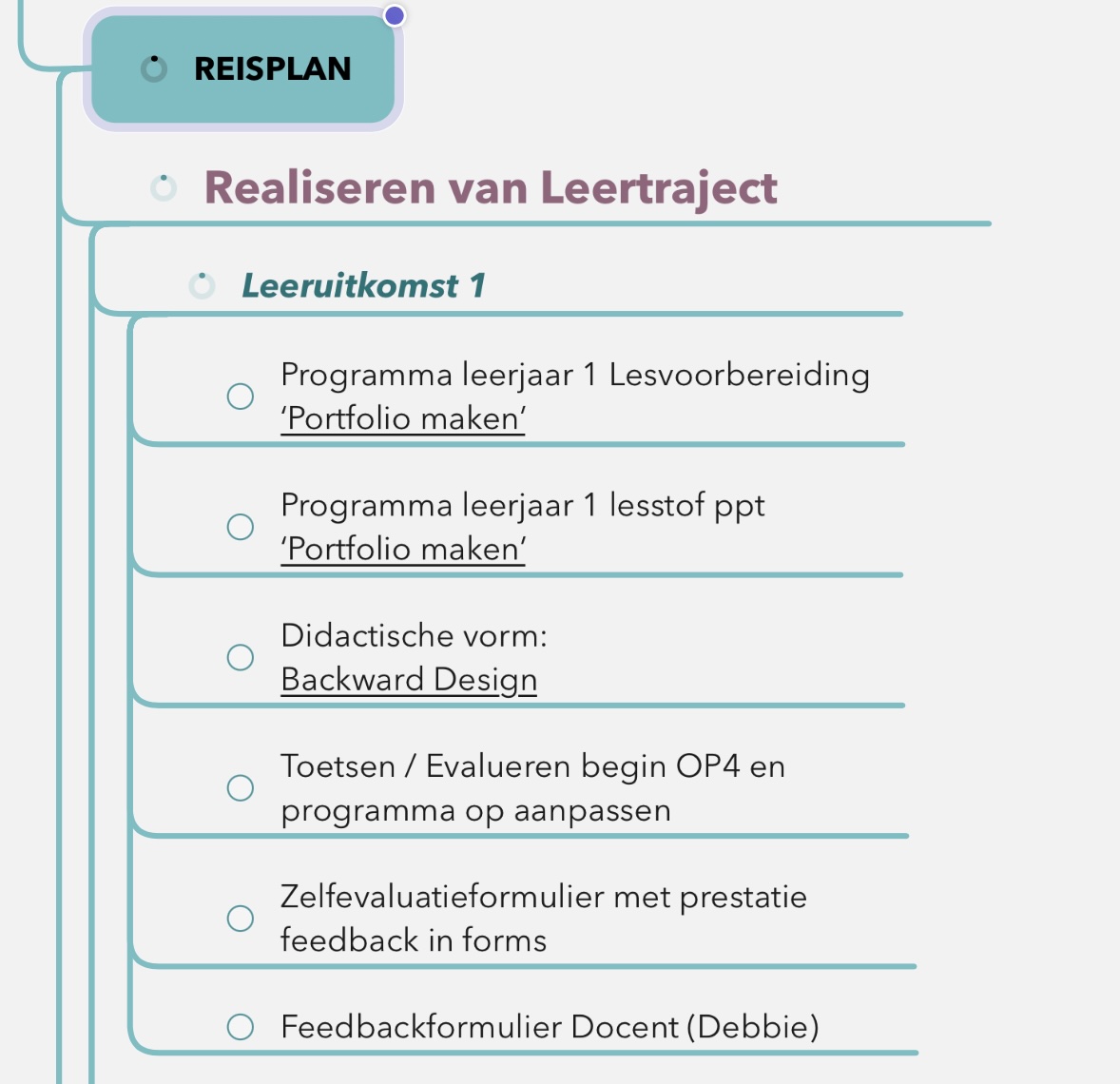 PDG-reisplan & bewijsmateriaalDrie fasen: ontwerp, uitvoering, evaluatie van een leertraject. Kies een vak of project, overleg met teamleider over inzet volgend jaar. Verzamel feedback (video, interviews, enquêtes), theoretische onderbouwing en reflecties in portfolio. Focus op wat je hebt gedaan en gaat doen; portfolioproducten hoeven niet nieuw te zijn, maar wél van een theorie-reflectie te voorzien.