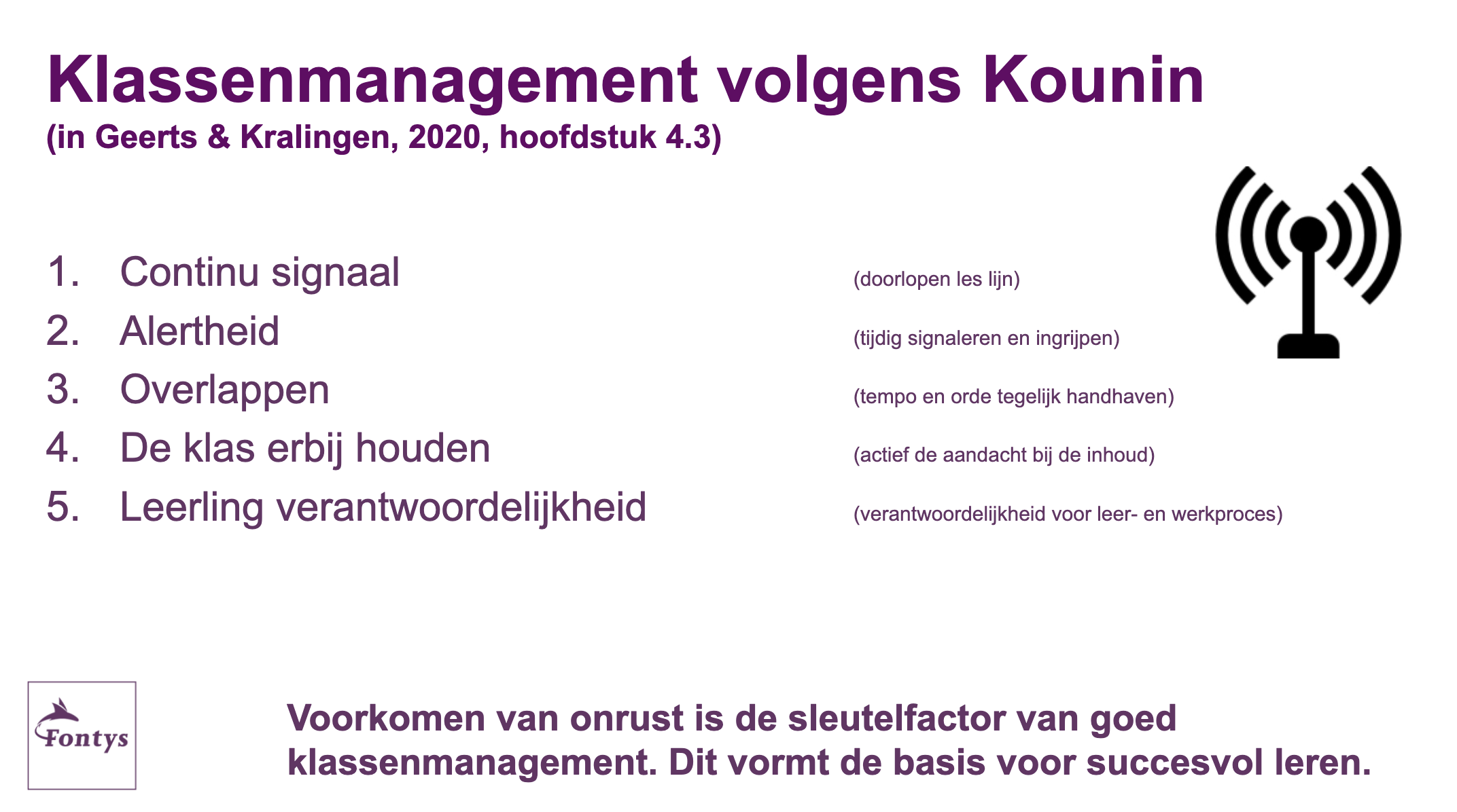Klassenmanagement: goede lesvoorbereiding, opstelling van tafels/stoelen, regie voeren zonder autoritair te zijn, duidelijke routines en differentiatie naar leerbehoefte.