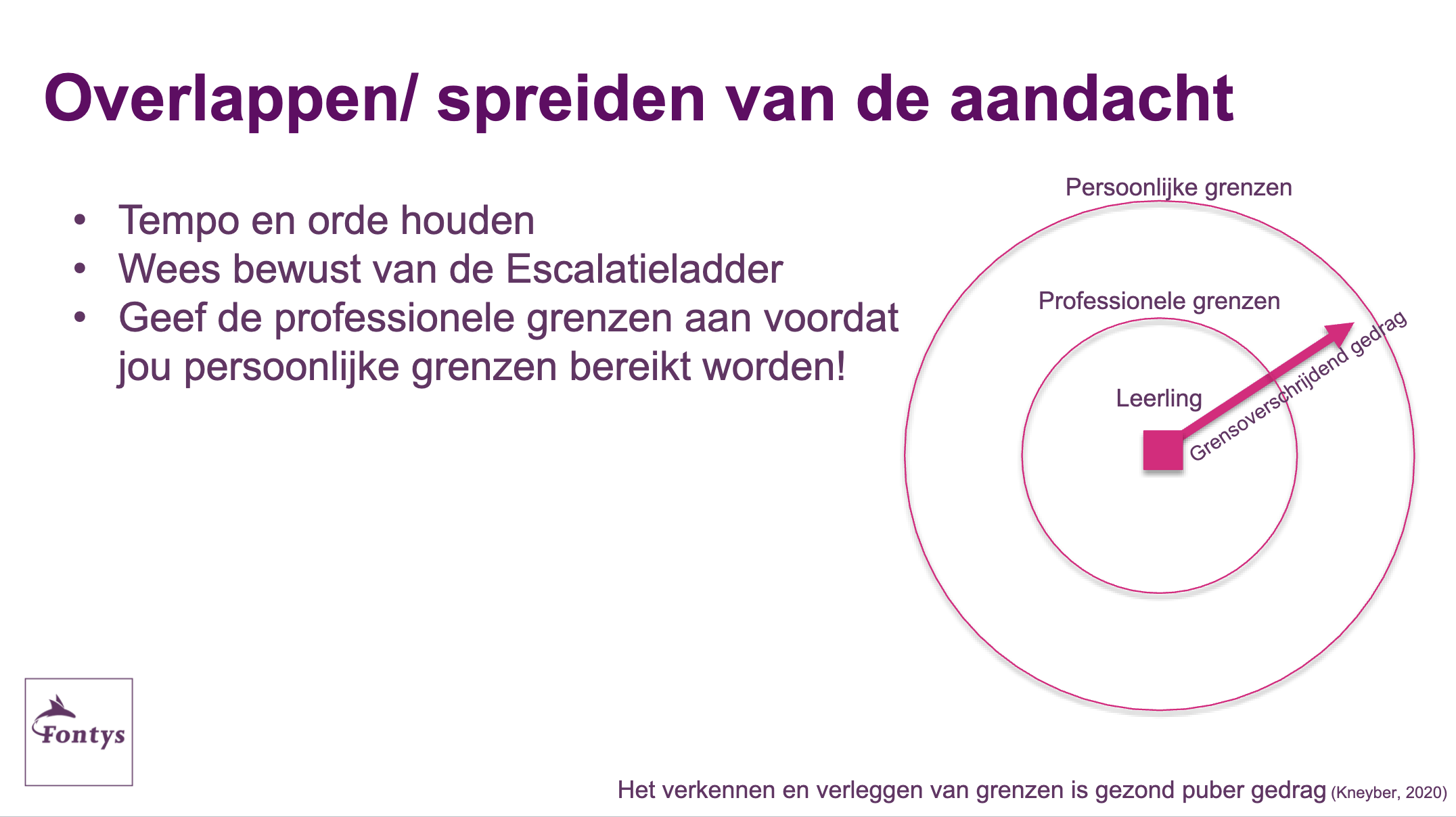 Omgaan met grensoverschrijdend en storend gedrag – Waarschuwen of uitsturen: • Eerste signaalfunctie van een waarschuwing • Eruit sturen als laatste sanctie – Pitfalls van autoritair optreden: • Risico op vijandigheid, ontmoediging van zelfsturing • Reacties van leerlingen als spiegel voor docentgedrag – Gevaren van te meegaand handelen: • Onvoldoende grenzen, vervagende regels • Ontbreken van respect en structuur – Escalatiestappen: • Duidelijke protocollen, overleg met zorgcoördinator of teamleider • Documenteren van incidenten